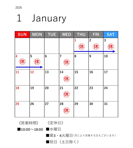 2026年1月の営業日カレンダーです