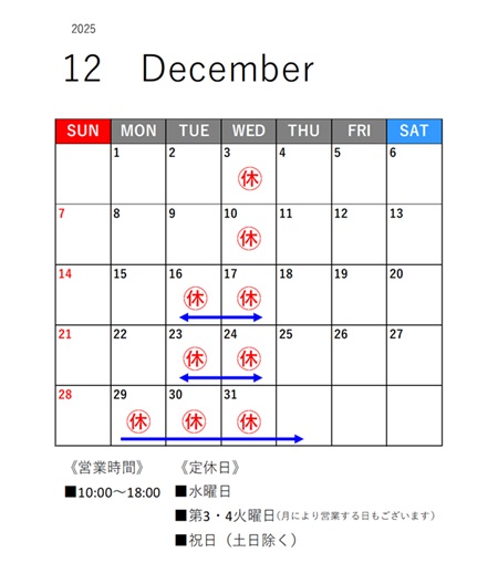 2025年12月の営業日カレンダーです