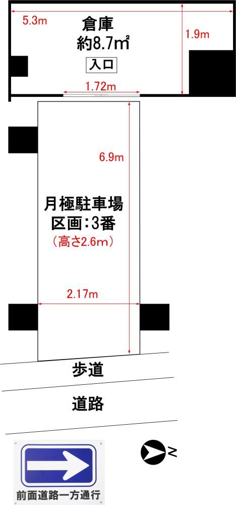 | 備 考 | ※任意保険加入要 ※更新事務手数料11,000円(税込) ※契約事務手数料:33,000円(税込) ※保管場所使用承諾書発行代:5,500円(税込) ※図面と現況が異なる場合、現況を優先いたします。 ※前面道路一方通行 <倉庫内に保管してはいけない物> ・貴重品 ・危険物(発火、引火しやすい物・爆発の恐れのある物) ・腐敗、変形しやすい物・悪臭を発する物 ・動物・植物等 ・その他(物品の収納以外の目的で使用する物)等 |