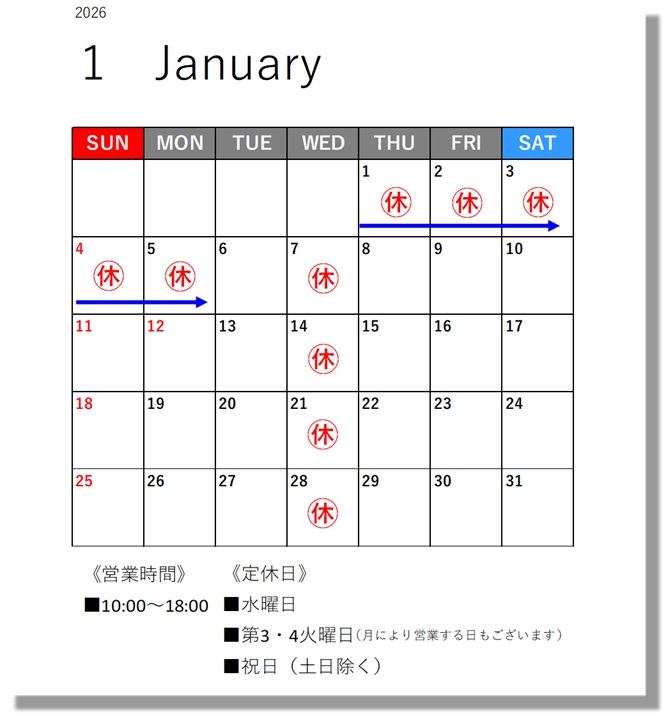 2026年1月の営業日カレンダーです