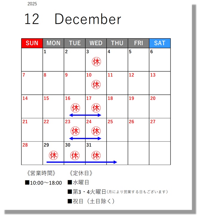 2025年12月の営業日カレンダーです